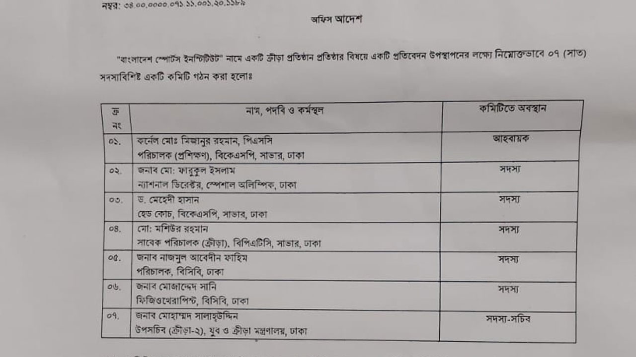 ২১ আগস্ট ক্রীড়া মন্ত্রণালয় অফিস আদেশের মাধ্যমে এই কমিটি গঠন করেছে। এক মাসের মধ্যে ইনস্টিটিউটের সুনির্দিষ্ট কর্মপরিধি, অর্ন্তভূক্ত বিভাগ, প্রয়োজনীয় অবকাঠামো, সুবিধাদি-ফলাফল নিয়ে সুপারিশ প্রদান করতে বলা হয়েছে। প্রথম সভায় একেবারে প্রাথমিক আলোচনা হয়েছে। আরো কয়েকটি সভা করে এই প্রতিষ্ঠানের অর্গানোগাম ও প্রয়োজনীয় বিষয় নিয়ে কর্তৃপক্ষকে রিপোর্ট প্রদান করবে এই কমিটি। প্রয়োজনে সময় বাড়ানোর আবেদন করতে পারে।