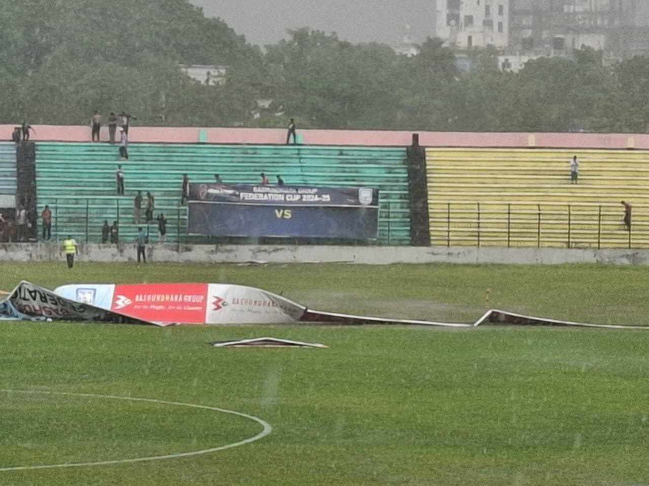 সেই তাবুও বাতাসে উড়ে গেছে। গ্যালারিতে কোনো শেড না থাকায় কালবৈশাখীর ঝড়ে অনেক সমর্থক মাঠে নেমে পড়েছেন। এই পরিস্থিতি খেলা আপাতত বন্ধ রয়েছে।