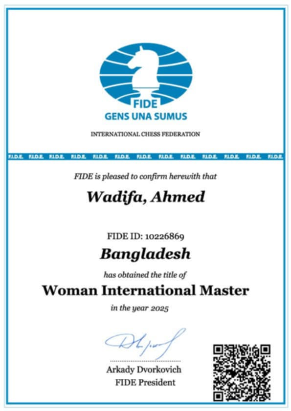 মার্চ মাসে শ্রীলঙ্কার কলম্বোতে এশিয়ান জোনাল দাবায় নারী বিভাগে চ্যাম্পিয়ন হয়ে আন্তর্জাতিক মহিলা মাস্টার হওয়ার যোগ্যতা অর্জন করেন ওয়াদিফা আহমেদ। আজ ১ মে ফিদে প্রকাশিত রেটিং ও টাইটেলে ওয়াদিফাকে আন্তর্জাতিক মহিলা মাস্টারের খেতাব দেয়া হয়। রাণী হামিদ, শিরিন সুলতানা, শারমিন আক্তার লিজার পর ওয়াদিফা বাংলাদেশের চতুর্থ আন্তর্জাতিক মহিলা মাস্টার। জান্নাতুল ফেরদৌস জোনাল চ্যাম্পিয়ন হলেও রেটিং পূর্ণ না করতে পারায় এখনো খেতাব পাননি।