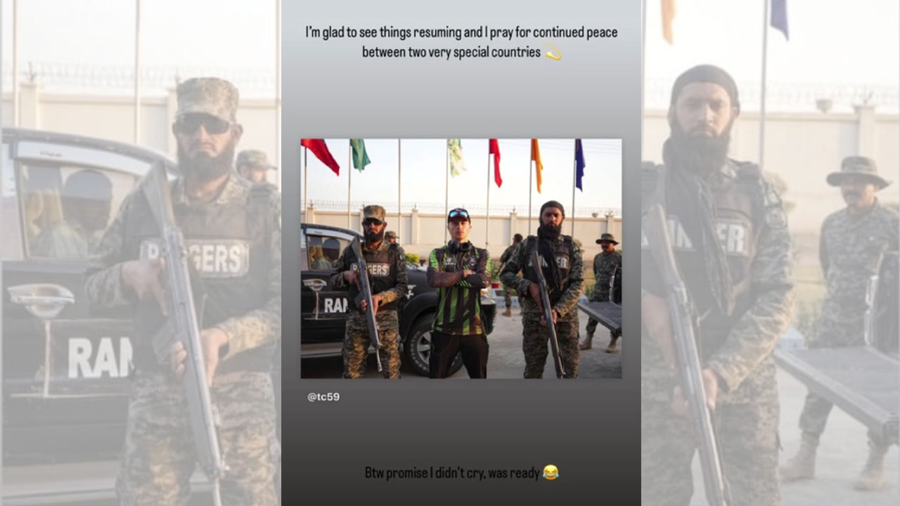 এবার অবশ্য রিশাদকে আরও খানিকটা বিব্রতকর অবস্থায় ঠেলে দিলেন টম কারেন নিজেই। যুদ্ধবিরতির পর পিএসএলের বাকি অংশ খেলতে পাকিস্তানে ঠিকই এসেছেন ইংল্যান্ডের হয়ে বিশ্বকাপ জেতা এই পেসার। ফিরে এসে ছবি তুলেছেন পাকিস্তানের সীমান্তরক্ষী বাহিনী রেঞ্জার্সের দুই সদস্যের সঙ্গে।