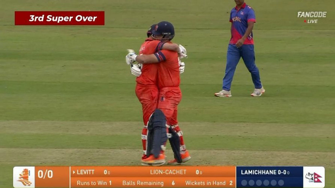 দুটি সুপার ওভারেও সমাধান না আসায় ম্যাচ যায় তৃতীয় সুপার ওভারে। এখানে বল হাতে নেদারল্যান্ডসের জয় নিশ্চিত করে দেন অফ-স্পিনিং অলরাউন্ডার জ্যাক লায়ন-ক্যাশে। ৪ বলে কোনো রান খরচ না করেই তুলে নেন দুই উইকেট। নেদারল্যান্ডসের প্রয়োজন ছিল মাত্র একটি রান। ব্যাট হাতে নামেন মাইকেল লেভিট। সান্দীপ লামিচানের প্রথম বলেই আসে ছক্কা। তাতেই নাটকীয় জয় তুলে নেয় নেদারল্যান্ডস।