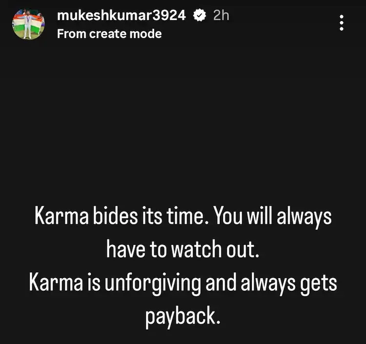 নিজের ইনস্টাগ্রাম স্টোরিতে মুকেশ বুধবার লিখেছেন, “কর্মফল সময়মতো পেতেই হবে। সেটা সবার মাথায় রাখা উচিত। পাপ কিন্তু কাউকে ছাড়ে না। সময় হলে পাপের ফল পেতেই হবে।” ঠিক কাকে উদ্দেশ্য করে বা কেন এই পোস্ট করলেন মুকেশ সেটা স্পষ্ট নয়। ব্যক্তিগত জীবনের কোনো সমস্যার জন্য এই পোস্ট নাকি খেলার জগতের কাউকে নিশানা, সেটাও অস্পষ্ট।