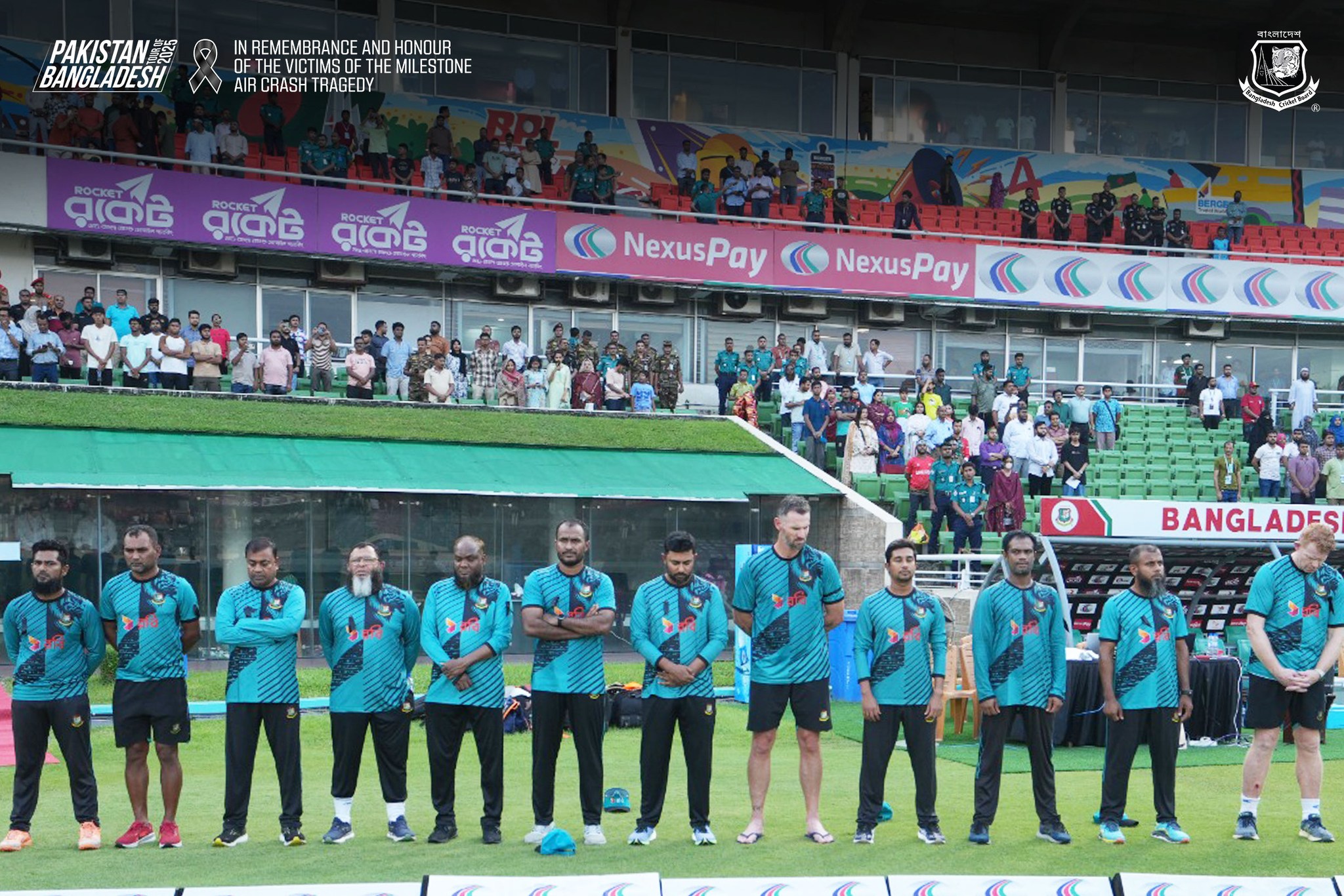 খেলা শুরুর আগে বিমান দুর্ঘটনায় হতাহতদের স্মরণে এক মিনিট নীরবতা পালন করেছে দুই দল। এ সময় দাঁড়িয়ে নীরবতা পালন করেন মাঠে উপস্থিত দর্শকরাও।