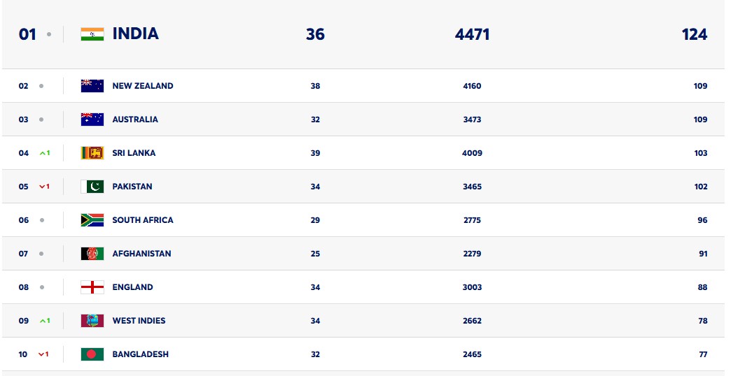 ১০২ রেটিং পয়েন্ট নিয়ে পাকিস্তান পাঁচে ও ১০৩ রেটিং পয়েন্ট নিয়ে চারে আছে শ্রীলঙ্কা। আইসিসির দলীয় ওয়ানডে র্যাঙ্কিংয়ে শীর্ষ তিনে যথারীতি অবস্থান করছে ভারত, নিউজিল্যান্ড ও অস্ট্রেলিয়া।