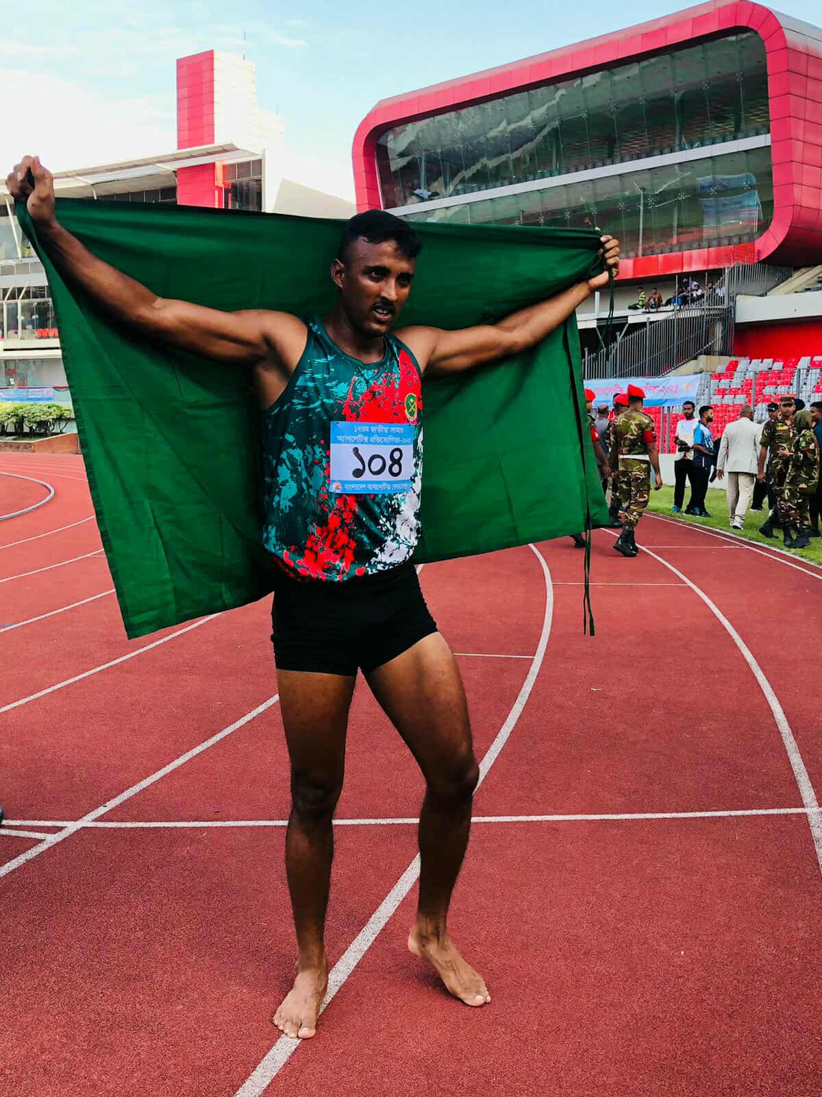ইংল্যান্ড প্রবাসী দ্রুততম মানব ইমরানুর রহমান ২০০ মিটারের শুরুটা ভালোই করেছিলেন। ৫০ মিটার দৌড়ানোর পর ট্র্যাক থেকে ছিটকে যান। এরপর বাংলাদেশ সেনাবাহিনীর তারেক রহমান নিজের সঙ্গে নিজেই লড়েছেন অনেকটা। ২২.০৪ সেকেন্ড টাইমিং নিয়ে ২০০ মিটারে স্বর্ণ জেতার অভিষেক করেছেন। ইমরানের মতো অ্যাথলেট থাকা সত্ত্বেও তার প্রথম হওয়ার বিশ্বাস ছিল, ‘ইমরান ভাইয়ের স্টেপিং ভালো। আমি চেষ্টা করেছি কার্ভে জোর দিতে। তিনি পুরো দৌড়ে থাকলেও আমি প্রতিদ্বন্দ্বিতা করতাম। আমার চ্যাম্পিয়ন হওয়ার আত্মবিশ্বাস ছিল।’
