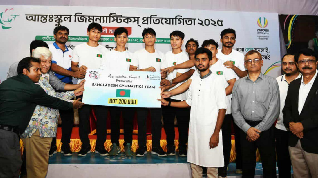 সম্প্রতি অনুষ্ঠিত সিঙ্গাপুর ওপেনে পদক বিজয়ী জিমন্যাস্টদের মধ্যে ২ লাখ টাকার আর্থিক পুরস্কারের চেক প্রদান করেন ক্রীড়া উপদেষ্টা। জিমন্যাস্টিক ফেডারেশনের সভাপতি সৈয়দ আবু নাসের বখতিয়ার আহমেদের সভাপতিত্বে অনুষ্ঠানে অন্যান্যের মধ্যে উপস্থিত ছিলেন যুব ও ক্রীড়া সচিব মো. মাহবুব উল আলম এবং সাধারণ সম্পাদক হাবিবুর রহমানসহ ফেডারেশনের কর্মকর্তাগণ।