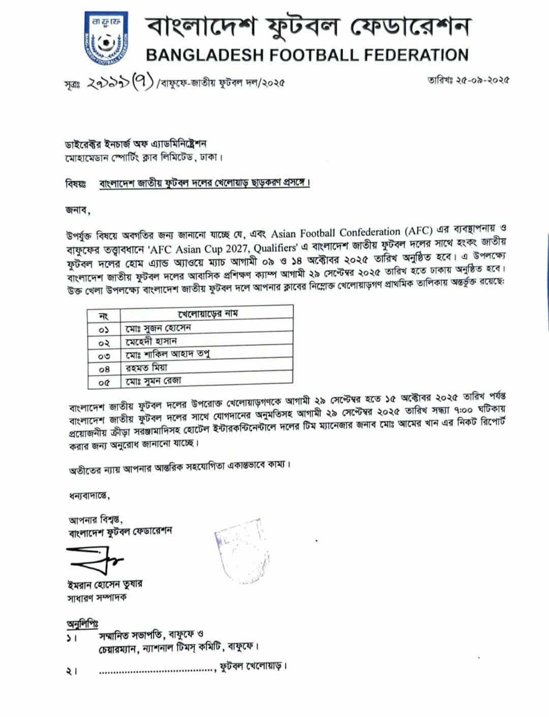 ক্লাবগুলোতে যে সকল ফুটবলার ছাড় করণের জন্য চিঠি দিয়েছে ফেডারেশন