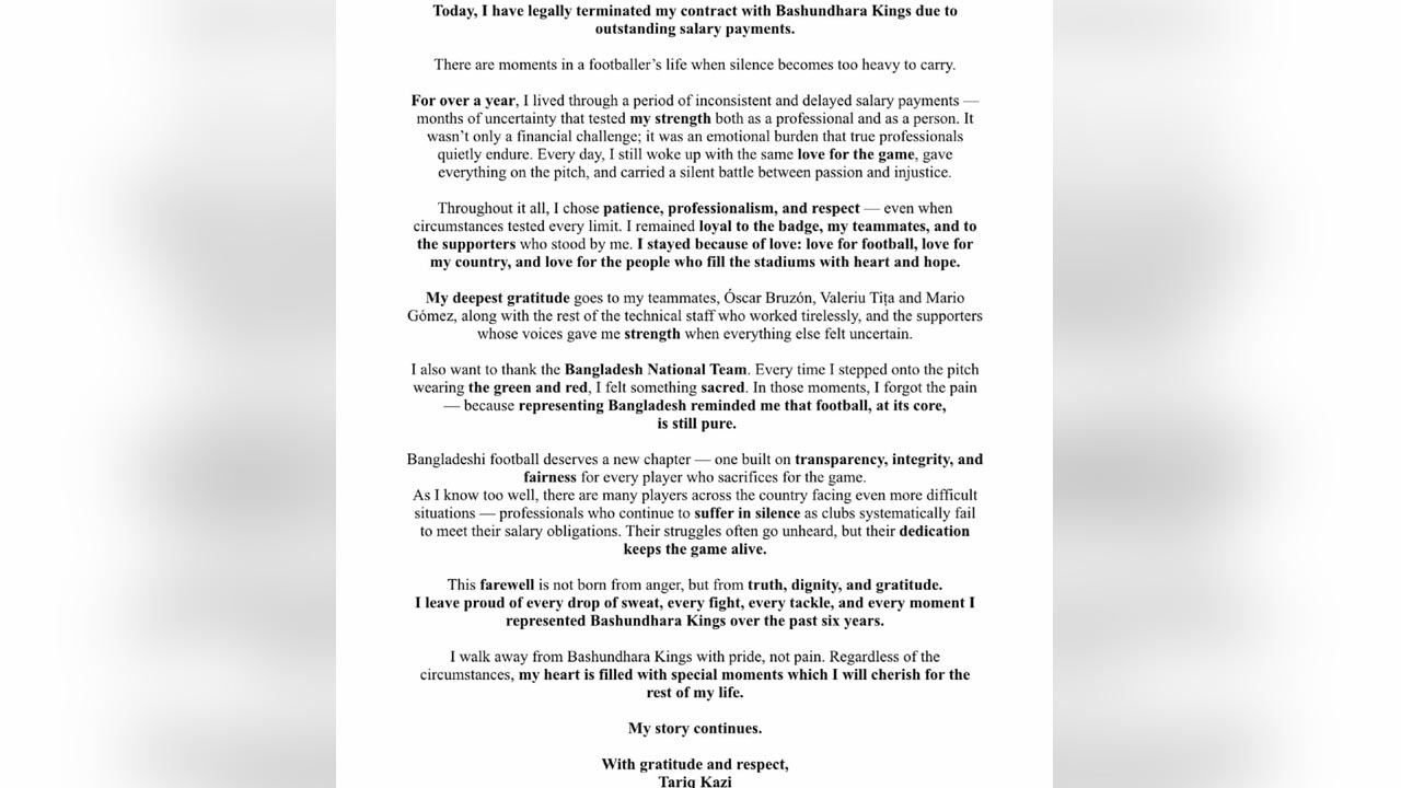 তারিক কাজী ২০২৫-২৬ মৌসুমের জন্য বসুন্ধরা কিংসের সঙ্গে নিবন্ধিত হয়েছেন। ইতোমধ্যে তিনি কিংসের হয়ে এএফসি চ্যালেঞ্জ লিগ ও ঘরেয়া ফুটবলও খেলেছেন। দিন তিনেক পর কিংস এএফসি চ্যালেঞ্জ লিগের মূল পর্ব খেলতে কুয়েত রওনা হবে। এমন সময় তারিক কাজীর এমন ঘোষণা ক্লাবের জন্য বড় বিপদ।