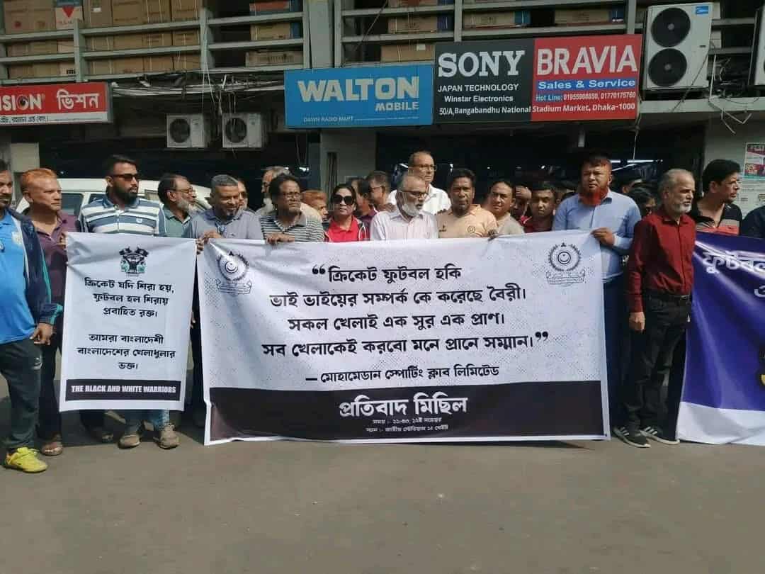 দেশের অন্যতম ঐতিহ্যবাহী ক্লাব মোহামেডান। তাদের সমর্থক ও কোচিং স্টাফরা ক্লাবের পক্ষ থেকে ব্যানার এনেছে। সেখানে লেখা ছিল,‘ক্রিকেট ফুটবল হকি ভাই ভাইয়ের সম্পর্ক কে করেছে বৈরী। সকল খেলাই এক সুর এক প্রাণ। সব খেলাকেই করবো মনে প্রাণে সম্মান।’ মোহামডোন ছাড়াও রহমতগঞ্জ ক্লাব, বাংলাদেশ ফুটবল সাপোর্টার্স ফোরামসহ ফুটবলসংশ্লিষ্ট আরও অনেক ব্যক্তি, প্রতিষ্ঠান ব্যানার ও ফেস্টুন নিয়ে প্রতিবাদ মিছিলে অংশ নেন।