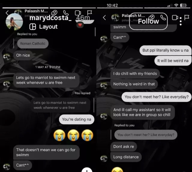 একগুচ্ছ চ্যাটে ম্যারি ডি’কোস্তা নামে এক নারী ও পলাশের কথোপকথন। ওই নারীই তার ইনস্টাগ্রাম অ্যাকাউন্টে এসব স্ক্রিনশট শেয়ার করেছেন। যেখানে পলাশকে তার রূপের প্রশংসা করতে দেখা গিয়েছে। তার সঙ্গে দেখা করতে তো চেয়েছেনই, সাঁতারও কাটতে বলেছেন।