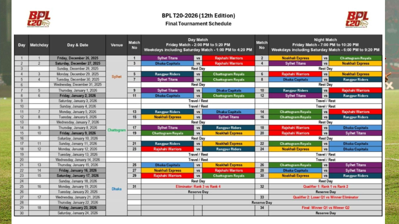 বিপিএলের ফাইনাল ম্যাচ হবে ২৩ জানুয়ারি, ২০২৬। ফাইনালের জন্য আছে রিজার্ভ ডে। ২৪ জানুয়ারি রিজার্ভ ডে থাকছে।