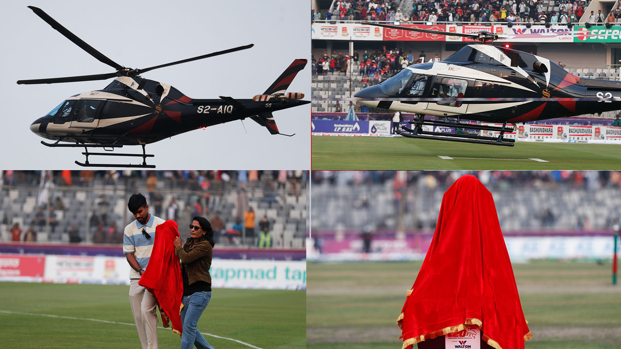 হেলিকপ্টারে করে মিরপুরে নামল হীরাখচিত ট্রফি