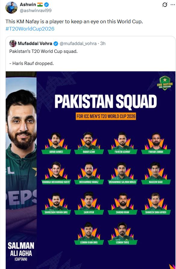 আর এই ২৩ বছর বয়সী ক্রিকেটারের দিকেই নজর রাখতে বলেছেন ভারতের সাবেক তারকা ক্রিকেটার রবিচন্দ্রন অশ্বিন। সামাজিক যোগাযোগ মাধ্যম এক্সে (টুইটার) পাকিস্তানের বিশ্বকাপ একাদশ শেয়ার করে একটি পোস্ট করেছেন অশ্বিন। সেই পোস্টের ক্যাপশনে অশ্বিন লেখেন, ‘‘এই কেএম নাফি বিশ্বকাপে নজর রাখার মতো একজন ক্রিকেটার।’’