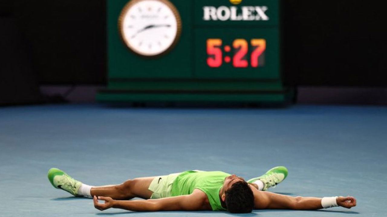 ২২ বছর বয়সী আলকারেজ প্রথমবার অস্ট্রেলিয়ান ওপেনের ফাইনালে উঠলেন। সর্বকনিষ্ঠ পুরুষ খেলোয়াড় হিসেবে ক্যারিয়ার গ্র্যান্ড স্লাম জেতার খুব কাছে তিনি। প্রথম সেট ৬-৪ এ জিতে ম্যাচের নিয়ন্ত্রণ নেন আলকারাজ। দ্বিতীয় সেটে টাইব্রেকে জেতেন। তৃতীয় সেট জমে ওঠে নাটকীয়তায়, যখন আলকারাজ ঊরু ও কুঁচকির ব্যথায় মেডিক্যাল টাইম আউট চান।
