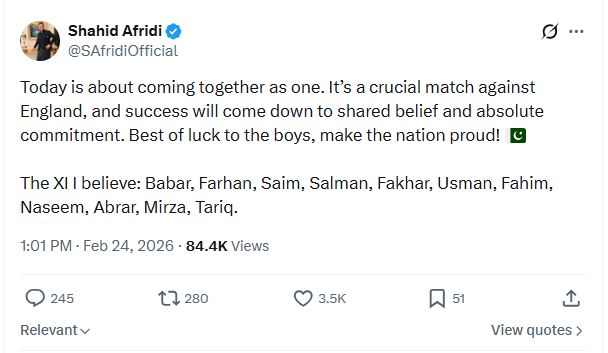 সামাজিক যোগাযোগ মাধ্যম এক্সে একটি পোস্ট করেন আফ্রিদি। ইংল্যান্ডের বিপক্ষে ম্যাচ নিয়ে সেখানে তিনি লেখেন, ‘‘আজকের দিনটি এক হয়ে দাঁড়ানোর। ইংল্যান্ডের বিপক্ষে এটি একটি গুরুত্বপূর্ণ ম্যাচ, আর সাফল্য নির্ভর করবে পারস্পরিক বিশ্বাস ও শতভাগ অঙ্গীকারের ওপর। ছেলেদের জন্য রইল শুভকামনা, দেশকে গর্বিত করো।’’