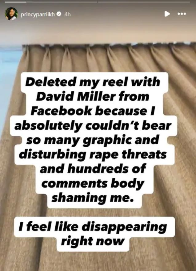 টি-টোয়েন্টি বিশ্বকাপের সুপার এইটে দক্ষিণ আফ্রিকার কাছে ৭৬ রানের বিশাল ব্যবধানে হেরেছে ভারত। সেদিন রাতেই প্রোটিয়াদের জয়ের নায়ক ডেভিড মিলারের সঙ্গে একটি ভিডিও পোস্ট করেন ভারতীয় মিডিয়া ইনফ্লুয়েন্সার আরজে প্রিন্সি পারিখ। এরপরই থেকেই ধর্ষণের হুমকি পাচ্ছেন তিনি।