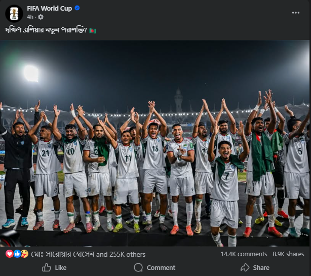 ফেসবুকে বাংলাদেশ ফুটবল দলের একটি ছবি পোস্ট করেছে ফিফা। আর ছবির ক্যাপশনে লিখেছে, ‘‘দক্ষিণ এশিয়ার নতুন পরাশক্তি?’’ এরপর বাংলাদেশের পতাকার ইমোজি দেওয়া হয়েছে।