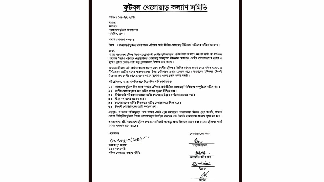 বাফুফে সভাপতি তাবিথ আউয়াল বরাবর দেওয়া চিঠিতে ফুটবলারদের অন্য দাবিগুলো হচ্ছে- দেশীয় ফুটবলারদের জন্য অধিক খেলার সুযোগ নিশ্চিত করা, দীর্ঘমেয়াদী পরিকল্পনার মাধ্যমে স্থানীয় খেলোয়াড় উন্নয়ন কার্যক্রম জোরদার করা, লিগে দল সংখ্যা বাড়ানো, খেলোয়াড়দের আর্থিক নিরাপত্তার দায়িত্ব ফেডারেশনের নেওয়া, বিদেশি খেলোয়াড় কোটা কমানো। ফুটবল খেলোয়াড় কল্যাণ সমিতির প্যাডে প্রধান সমন্বয়কারী আবুল হোসেন এক পাশে স্বাক্ষর করেছেন। অন্য পাশে বর্তমানে লিগে খেলা ফুটবলারদের পক্ষে আহসান হাবিব, আলমগীর করিব রানা, ইব্রাহিম ও মেহেদী স্বাক্ষর করেছেন।