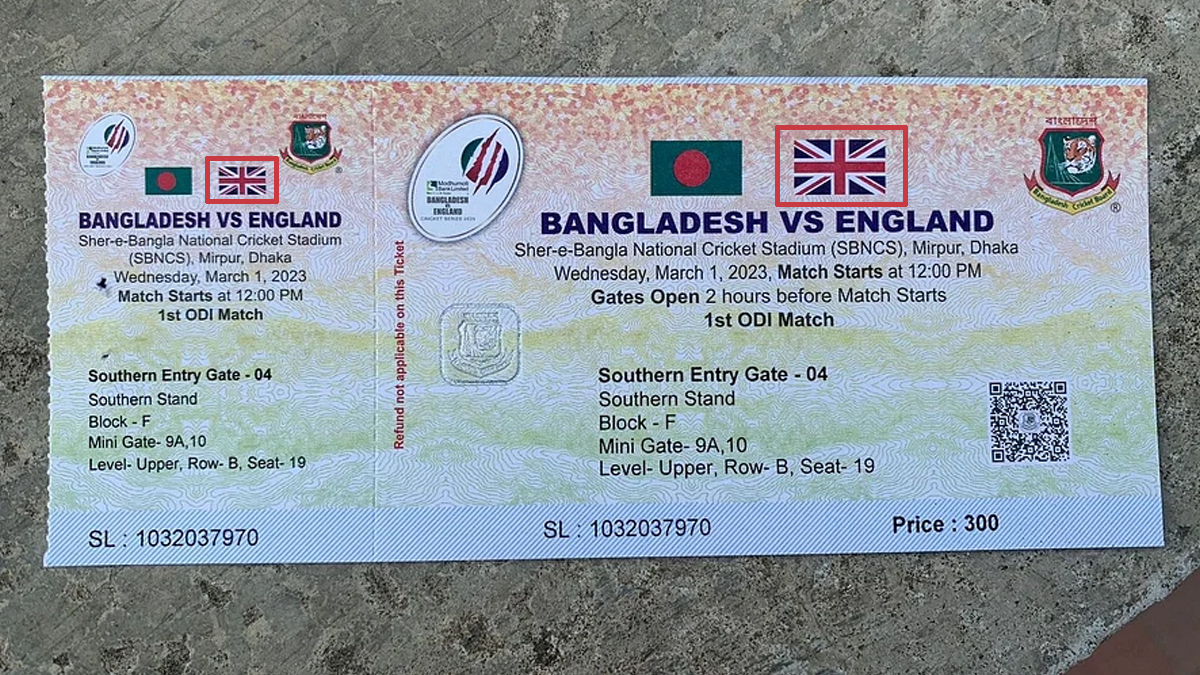 টিকিটে ইংল্যান্ডের পতাকা ভুল, বিসিবি বলছে ‘প্রিন্টিং মিসটেক’