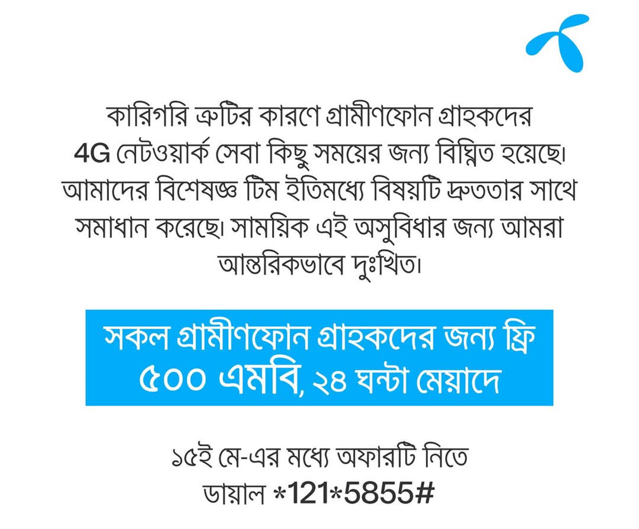 গ্রামীণফোনের পক্ষ থেকে জানানো হয়েছে, ‘এটি ছিল একটি অস্থায়ী কারিগরি ত্রুটি। নেটওয়ার্ক টিম তাৎক্ষণিকভাবে সমস্যার উৎস চিহ্নিত করে দ্রুততার সঙ্গে সমাধান করে।’