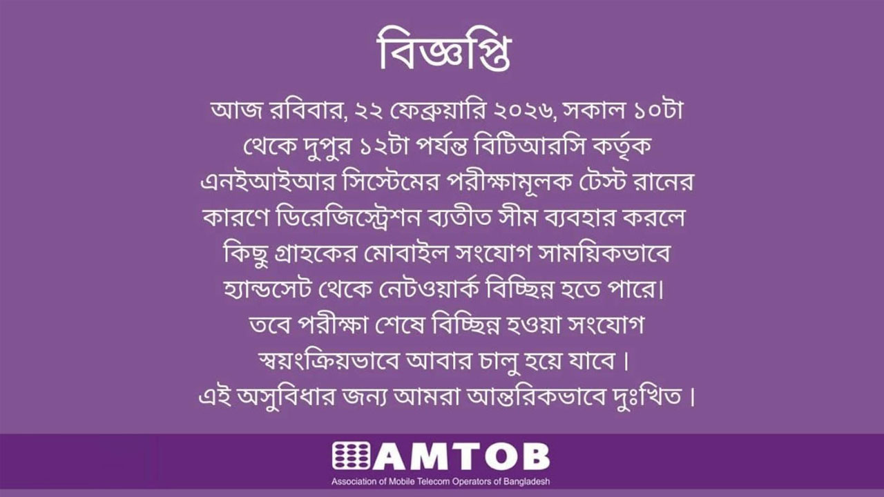 এতে বলা হয়েছে, আজ সকাল ১০টা থেকে দুপুর ১২টা পর্যন্ত বাংলাদেশ টেলিযোগাযোগ নিয়ন্ত্রণ কমিশন (বিটিআরসি) পরিচালিত এনইআইআর সিস্টেমের পরীক্ষামূলক টেস্ট রান অনুষ্ঠিত হবে। এ সময় ডিরেজিস্ট্রেশন ছাড়া সিম ব্যবহার করা হলে কিছু গ্রাহকের মোবাইল সংযোগ সাময়িকভাবে হ্যান্ডসেট থেকে নেটওয়ার্ক বিচ্ছিন্ন হতে পারে।